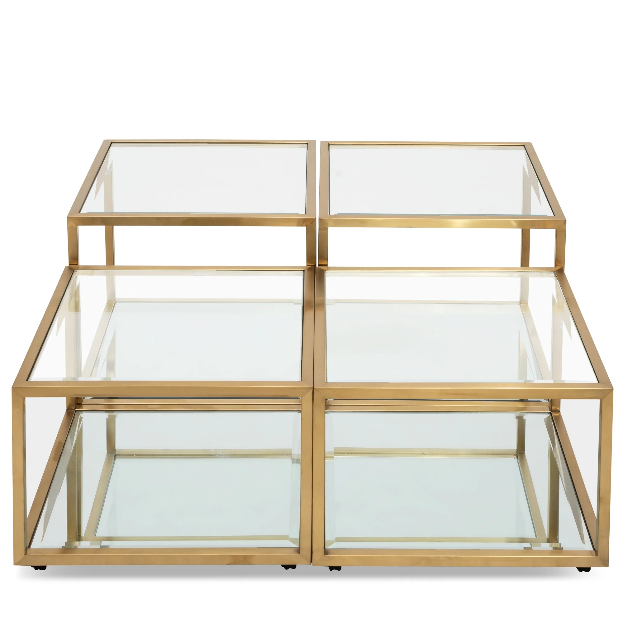 A bold choice, CCF2585-BS 100cm Glass Squared Coffee Table - Brushed Gold Base will anchor your living room with ultimate modern glamour. This set of 4 coffee tables is designed with 2 table top heights for a layered look, offering ample surface space for display and everyday use too. Chic and sophisticated, CCF2585-BS will update your decor with its statement-making charm.